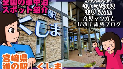 全国の車中泊スポットを紹介!!環境良し!しかも街中!道の駅くしま(宮崎)で車中泊/九州 道の駅としては珍しく町のど真ん中にある。なので交通の騒音なども大きめか…?と思いきや、駐車スペースが広大なので停める場所さえしっかりと選べればそこまで気にならず。歩いて行ける距離にコンビニもあるので深夜に到着しそうな時でも安心な環境。コインランドリーもコンビニ方面にあります。中々良い道の駅ですね、おすすめ! 2025.11.27 0全国の車中泊スポットを紹介!!全国道の駅 車中泊スポットもりりんパパの車中泊記事TOPページ九州 道の駅