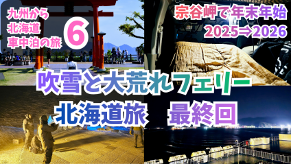 YouTubeチャンネル もりりんの旅チャン吹雪と大荒れフェリー 北海道車中泊旅、最終回 その⑥です。九州から日本最北端の北海道稚内市、年越し宗谷岬の最終回!車中泊8~9日目、新日本海フェリーにて北海道から本州へ。揺れまくりだったので寝まくったおかげで、深夜ながらもぐんぐんと車は進み、一気に九州を目指して車は進みます。動画の後半にて今回の旅の北海道での思い出話など、そして次回掲載のお話も書いております。 2026.04.05 0YouTubeチャンネル もりりんの旅チャン全国道の駅 車中泊スポット全国の車中泊スポットを紹介!!もりりんパパの車中泊記事TOPページ全国高速道SAPAの車中泊スポット