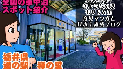 全国の車中泊スポットを紹介!!銭湯あり!駐車スペースは小さいが…道の駅禅の里(福井)で車中泊 駐車スペースは小さく幹線道路沿いでもあるのだが、建物奥の方に車を停めることが出来れば比較的静かな夜を過ごせる環境。コインランドリーまでは10キロ以上あるものの、コンビニは車で数分の位置にあり、更に敷地内に温泉施設があるので中々環境の整っている道の駅でした。冬は雪が積もることも多々あるのでその点にはご注意を。 2026.04.23 0全国の車中泊スポットを紹介!!全国道の駅 車中泊スポットもりりんパパの車中泊記事TOPページ中部 道の駅